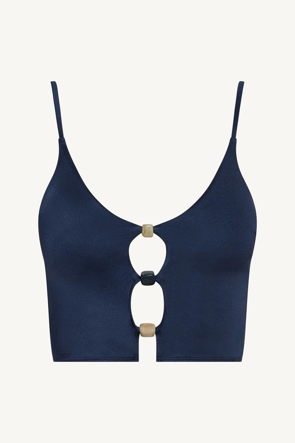 The Terra Cut Out Crop Top pairs bold front cutouts with adjustable straps for a flattering fit. An internal shelf bra with removable cups offers comfortable support, while the recycled resin bead detail adds an artisanal, sustainable finish—perfect for making a statement in the sun or paired with a white linen pant.