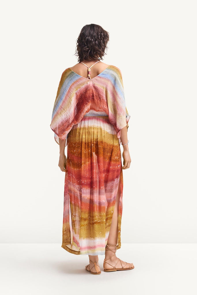 Inspired by the shifting layers of red rock formations, the Terra Forms print is hand-painted with pastels to evoke the natural flow of sediment and time. Printed on cupro chiffon, this airy, silk-like fabric offers a soft drape and breathable feel that elevates the fluidity of the print.