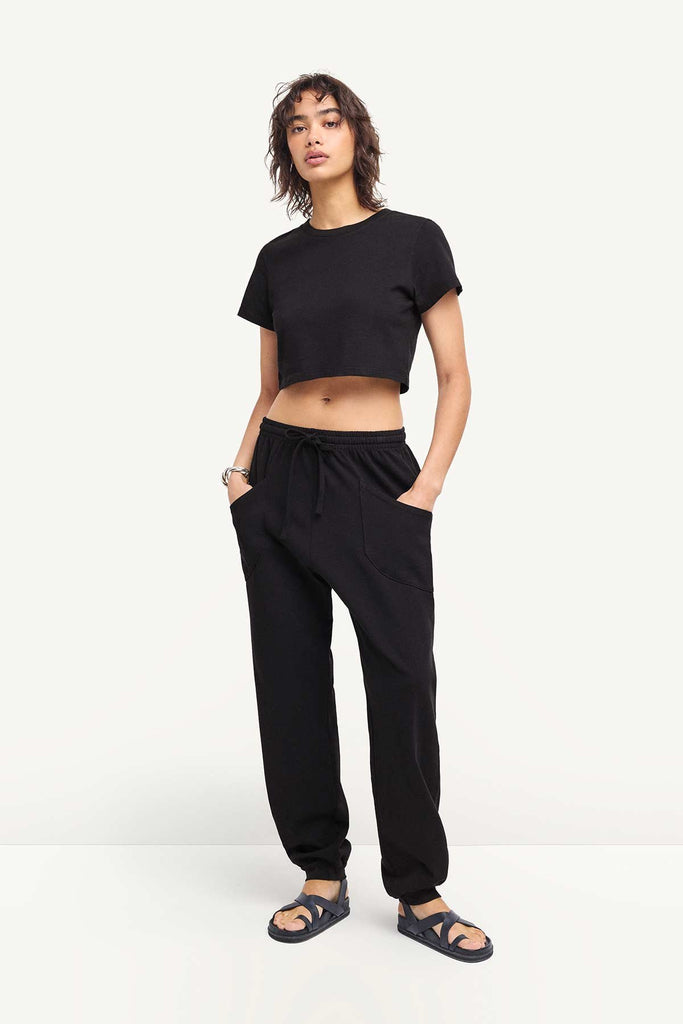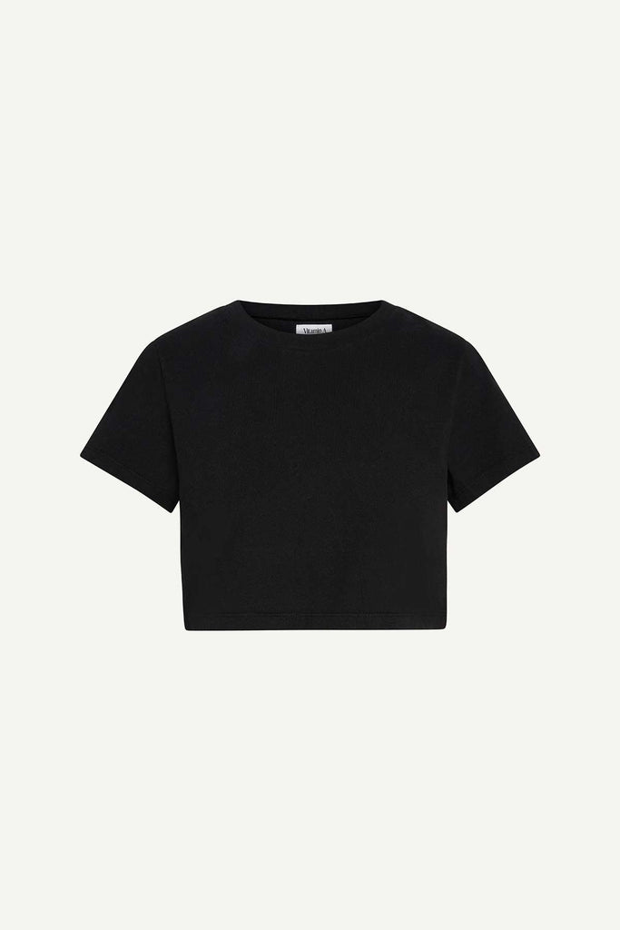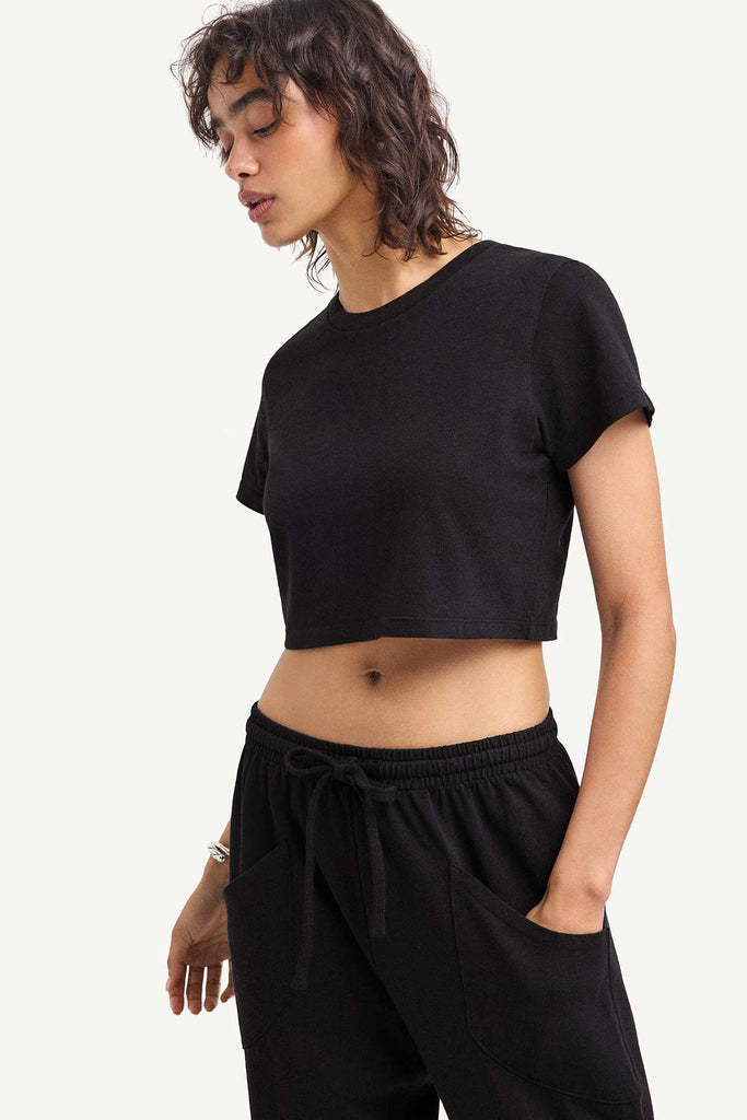 The Coast Fitted Crop Shirt is made from a soft, thick cotton jersey with 50% recycled cotton. Garment-dyed in classic Black for a sleek, versatile look. Simple, flattering, and effortless.