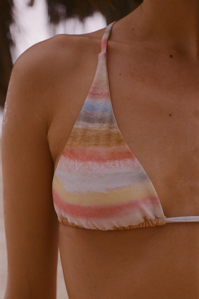 The Terra Halter Triangle Top features a classic triangle silhouette with ties at the back for a customizable fit. Recycled resin beads add a unique accent at the back, while removable cups offer optional coverage.