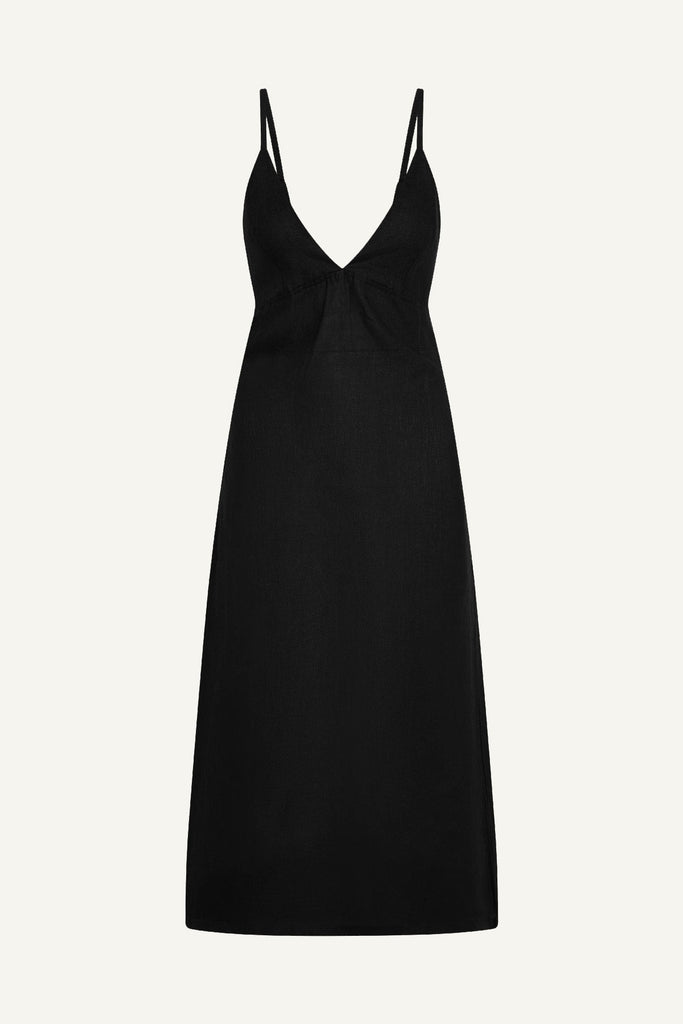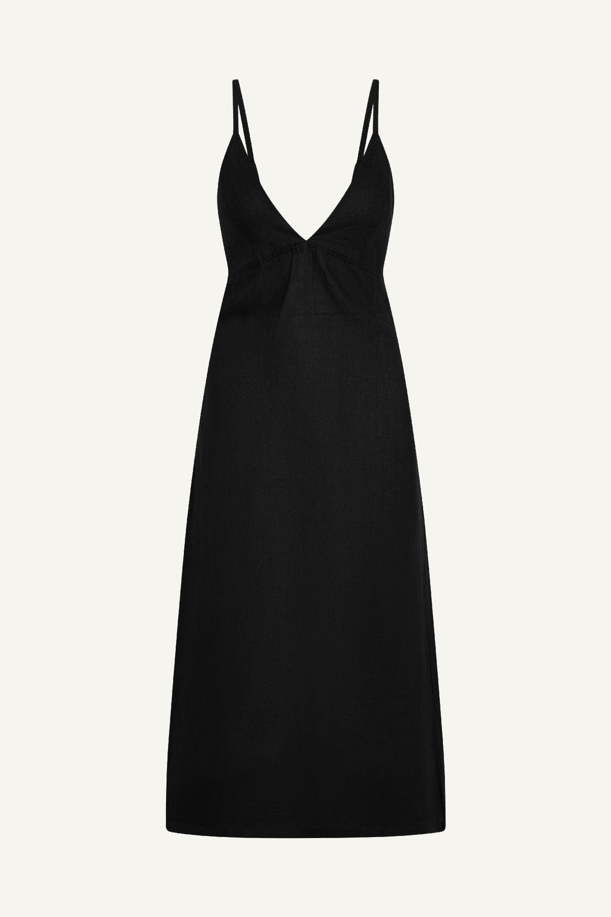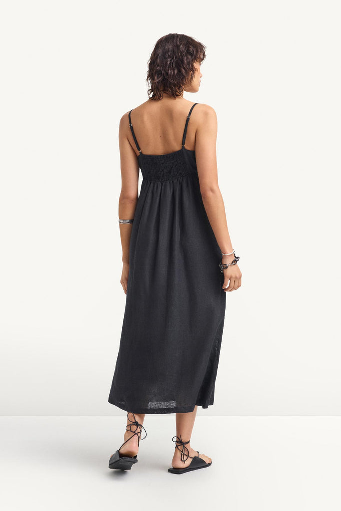 Understated and elegant, the Zella Dress is a vacation essential, ready to throw on over a swimsuit or dress up for dinner. Crafted from breathable linen, it features a flattering V-neckline, adjustable over-the-shoulder straps, and a smocked back for an effortless fit. Side seam pockets add a touch of ease, while the mid-length silhouette makes it endlessly versatile. Just add strappy sandals, a clutch, and a bold necklace to take it from day to night.
